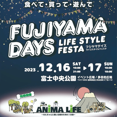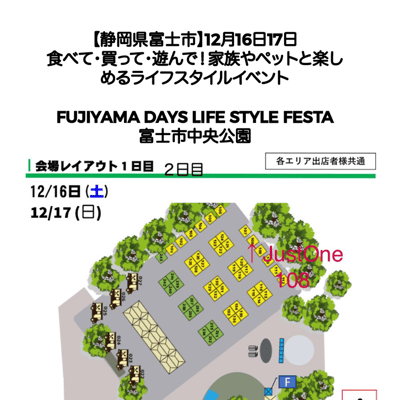 イベント&お知らせ · 2023/12/15 FUJIYAMA DAYS 12/16.17の詳細 週末イベント!JustOneのブース位置です。 ぜひ!遊びに来てください。 2023年12月16日(土)、17日(日) 食べて・買って・遊んで!家族やペットと楽しめるライフスタイルイベント 『FUJIYAMA DAYS LIFE STYLE FESTA(フジヤマデイズライフスタイルフェスタ)』 中央公園 イベント広場/多目的広場 tagPlaceholderカテゴリ: イベント